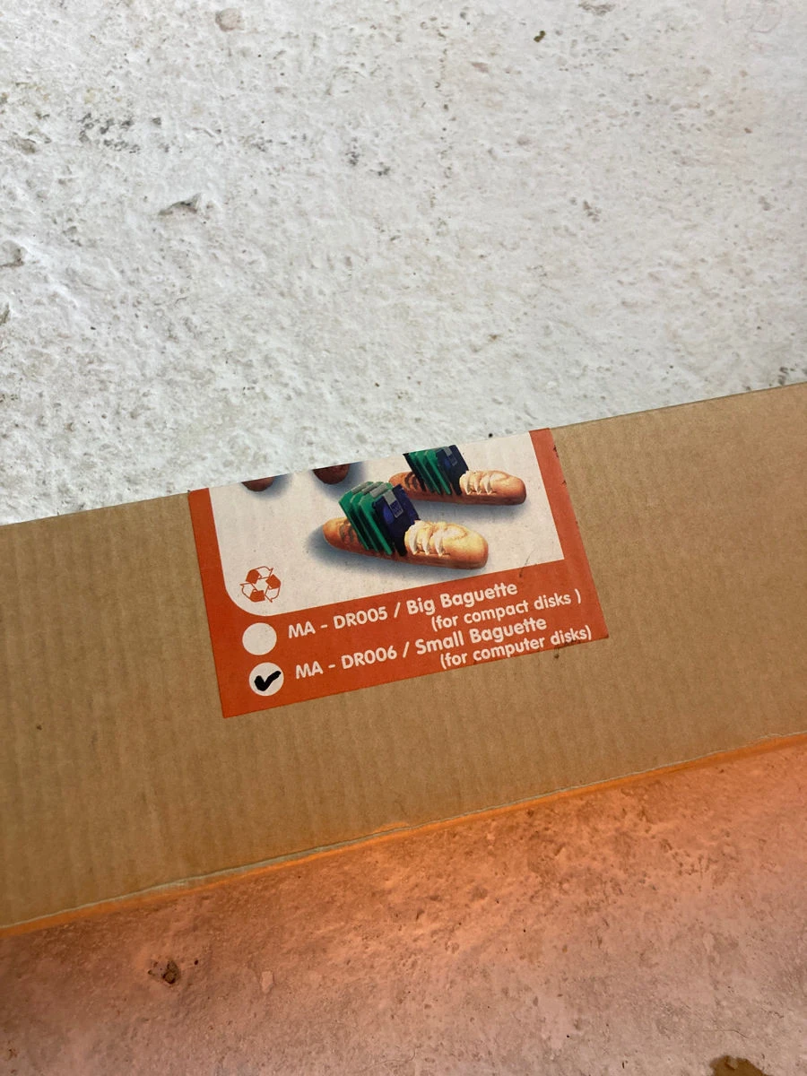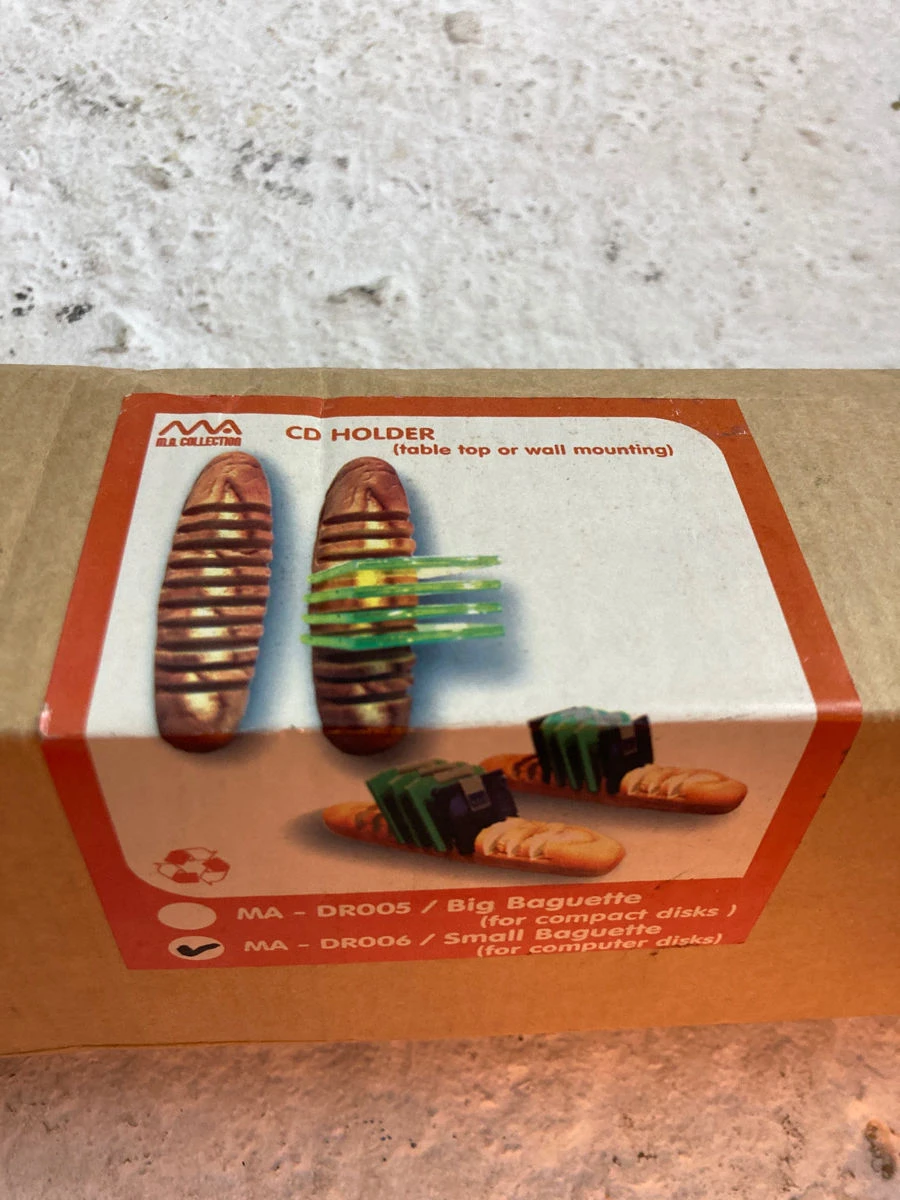 Πλαστική θήκη για CD η δισκέτες, σε σχήμα φραντζόλας. Μπορεί να σταθεί σε τοίχου ή τραπέζι. Αμετάχείριστη Με το κουτί της, δεκαετίας 90 τέλη. 10 θέσεων